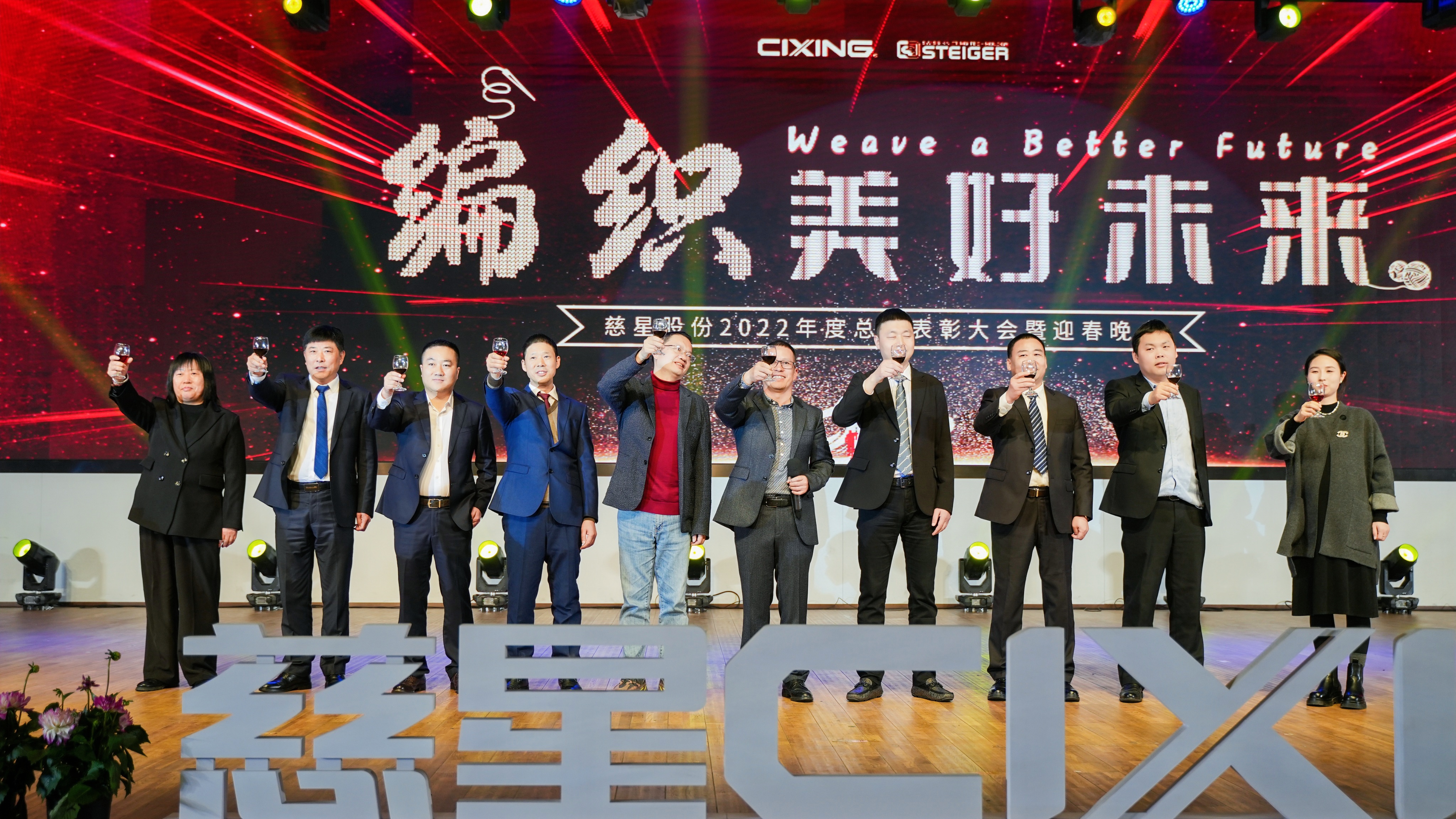 虎辞胜岁,兔跃新程!2月5日,编织美好未来——慈星股份2022年度总结表彰大会暨迎春晚会于慈星四楼多功能厅隆重举行。董事长孙平范带领公司管理层及全体员工欢聚一堂。同时,来自全国各地主要代理商,供应商,合作伙伴、客户共计1300余人共同参加晚会。晚会当天,约有213万人次通过图文直播收看慈星股份迎春晚会。